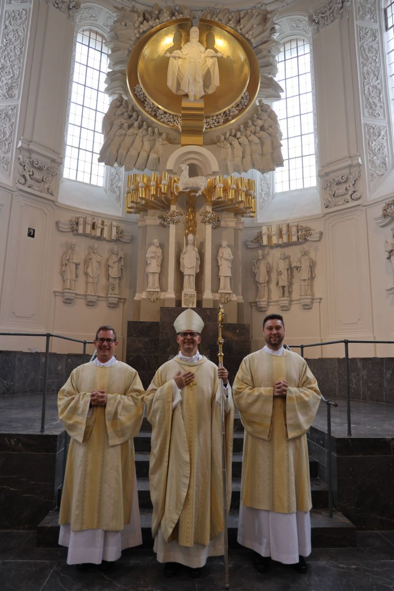 Würzburg (POW) Arbeiter des Herrn zu sein heißt, täglich neu zu beginnen. Das hat Bischof Dr. Franz Jung bei der Diakonenweihe im Würzburger Kiliansdom am Samstag, 26. September, betont. Unter Handauflegung und Gebet spendete der Bischof dem 33-jährigen Benjamin Schimmer aus der Filialgemeinde Neusetz-Mariä Himmelfahrt und dem 27-jährigen Manuel Thomas aus der Pfarrei Sankt Nikolaus von Flüe in Haibach die Diakonenweihe. Beide sind auf dem Weg zur Priesterweihe. Jesus spreche davon, dass seine Jünger wie Schafe unter Wölfe gesandt seien. Der Bischof erinnerte daran, dass es wichtig sei, mit Blick auf das Lamm Gottes, das in der Eucharistie im Mittelpunkt stehe, auch die eigene Ohnmacht anzunehmen. An dem Festgottesdienst unter Corona-Hygieneauflagen nahmen unter anderem Weihbischof Ulrich Boom, Regens Stefan Michelberger, Mitglieder des Domkapitels, zahlreiche Priester und Diakone sowie geladene Verwandte, Freunde und Bekannte der neuen Diakone teil. In seiner Predigt betonte der Bischof, die beiden Männer seien bereit, für den Herrn dorthin zu gehen, wo er sie sende, um ihm den Weg zu bereiten. Deswegen versprächen sie in der Weihe Gehorsam und Ehelosigkeit. Wie Bischof Jung betonte, sei das stellvertretend für die Gläubigen vollzogene Stundengebet Ort der täglichen Christuserkenntnis. Er ermunterte die beiden Weihekandidaten, offen für die Begegnung zu sein. Oft werde einem dann gegeben, was für den jeweiligen Dienst nottue. Zugleich werde darin deutlich, wozu man gesandt sei. „Oft bekommt man mehr zurück als man eingesetzt hatte“, erklärte der Bischof. Wichtig sei dafür, am Ort zu bleiben und nicht wegzulaufen. Papst Franziskus warne davor wegzulaufen, statt etwas durchzutragen und daran zu wachsen. Der Diakon sei dann wahrhaft ein Diener, wenn er annehme, was man ihm vorsetze – „an diesem Ort, mit diesen Personen, mit diesen Gegebenheiten und Traditionen“. Bischof Jung ermunterte die beiden Männer, täglich die Heilige Schrift zu meditieren. Es sei wichtig, der Welt zu sagen, was diese sich nicht selbst sagen könne, wann immer das gefordert sei. Das bedeute, das Ungeistliche zu überführen, Abirrende zurechtzuweisen, Kraft zu geben durch Ermuntern. „Die beste Verkündigung bleibt das eigene Leben“, sagte der Bischof. Zu Beginn der Weihe wurden die Kandidaten durch Regens Michelberger aufgerufen. Sie versprachen, ihr Leben an Jesus Christus auszurichten und ihm besonders in Armen, Kranken, Heimatlosen, Notleidenden und allen Ausgegrenzten zu dienen. Dem Bischof gelobten sie Gehorsam. Zudem erklärten Schimmer und Thomas ihre Bereitschaft, zukünftig zölibatär zu leben. Während der Anrufung der Heiligen lagen die beiden als Zeichen der Ganzhingabe an Christus ausgestreckt auf dem Boden. Danach legte ihnen Bischof Jung schweigend die Hände auf und sprach das Weihegebet. Nach der Weihe wurden die Diakone von ihren Praktikumspfarrern Dekan Oswald Sternagel (Ochsenfurt) und Pfarrer Thomas Menzel (Mellrichstadt) mit Stola und Dalmatik bekleidet. Von Bischof Jung bekamen Schimmer und Thomas das Evangelienbuch überreicht. Anschließend umarmten als Zeichen der brüderlichen Verbundenheit der Bischof und die Verantwortlichen des Priesterseminars die Neugeweihten. Am Ende des Gottesdienstes dankte Thomas im Namen der beiden Neugeweihten allen, die sie auf dem bisherigen Weg begleitet und an der Feier im Dom mitgewirkt haben. Musikalisch gestalteten Domorganist Professor Stefan Schmidt, Instrumentalisten aus Dettelbach, Kantor Markus Althanns und die Schola der Franziskanischen Gemeinschaft von Betanien die Feier. mh (POW) (4020/0999; E-Mail voraus)