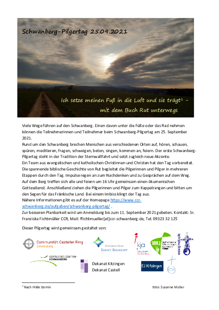 Nähere Informationen gibt es auf der Homepage https://www.ccr-schwanberg.de/aufgaben/schwanberg-pilgertag/.